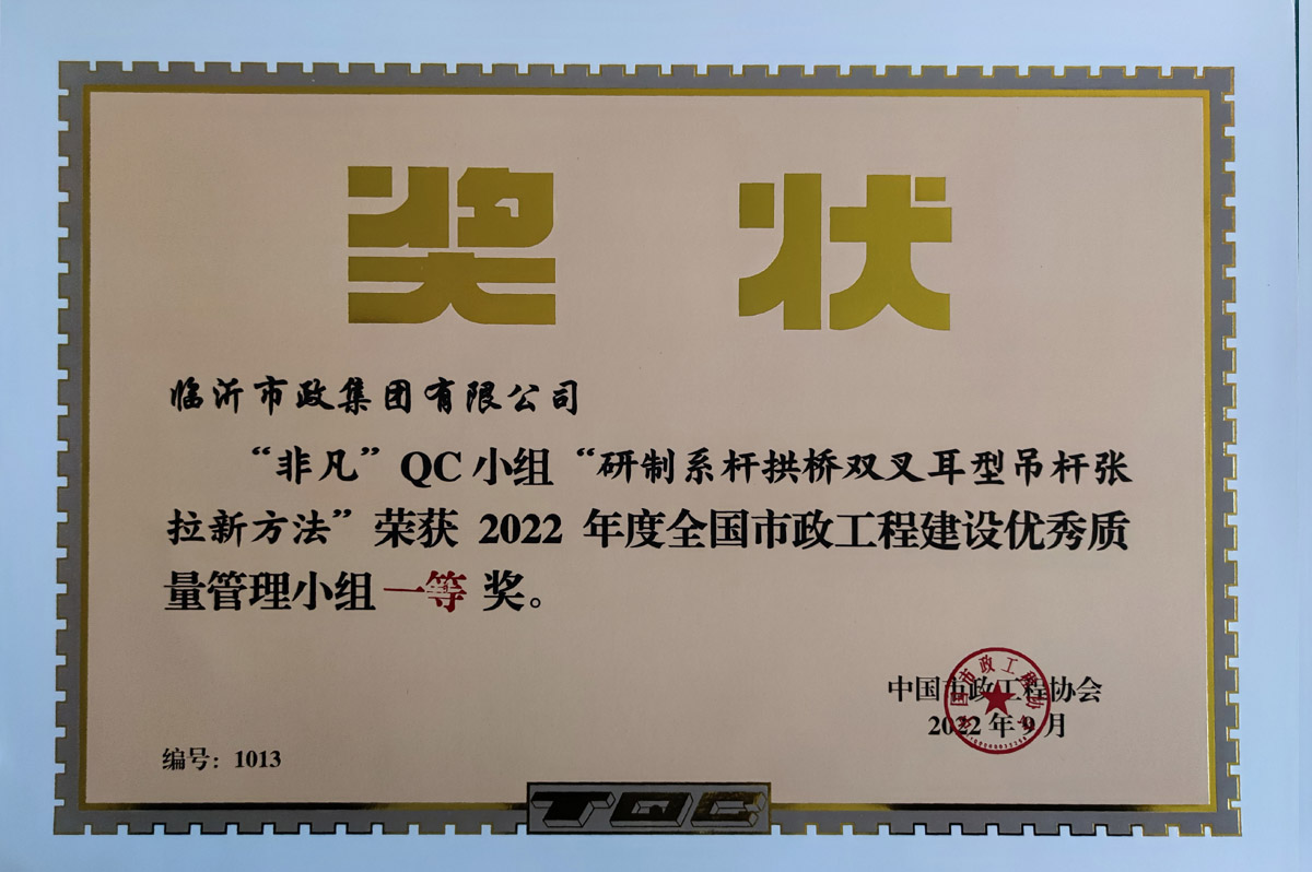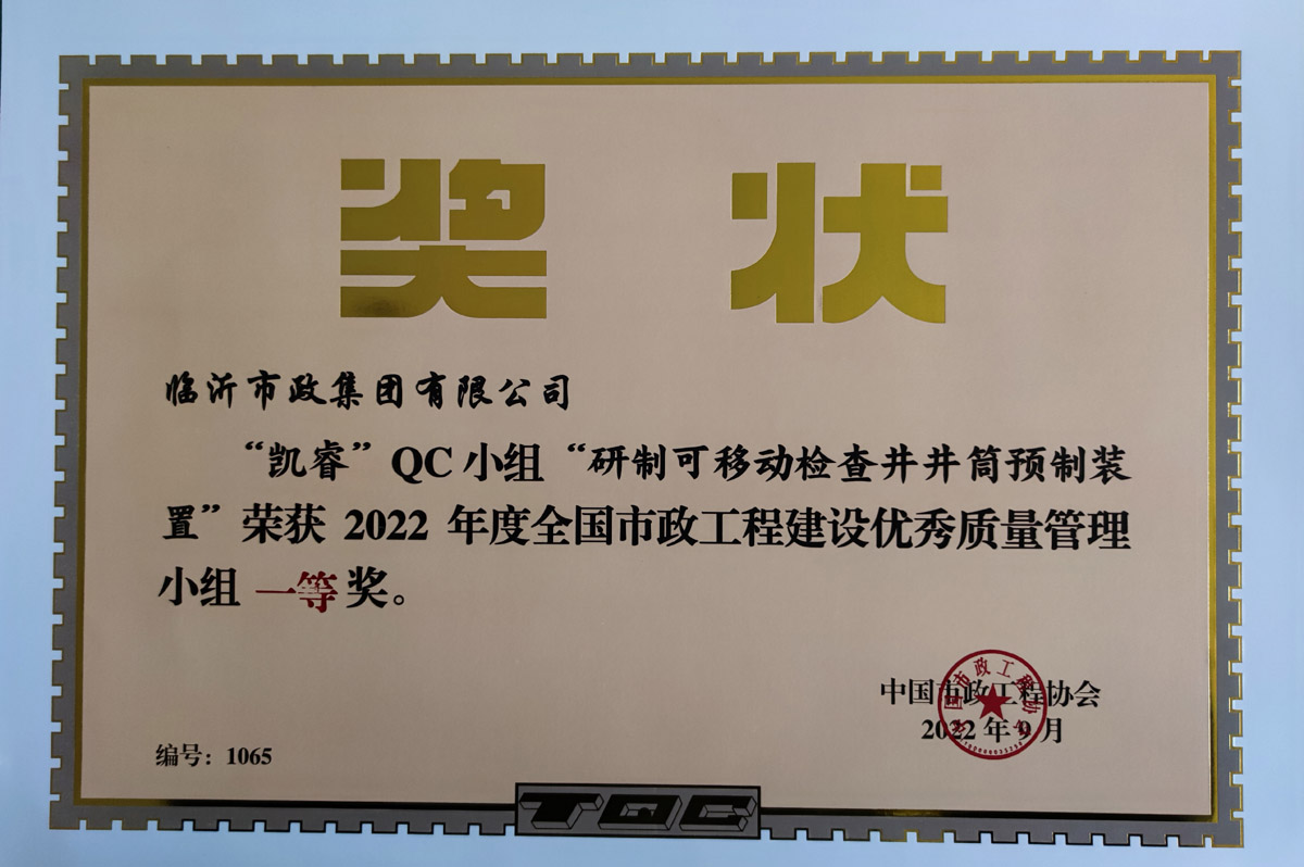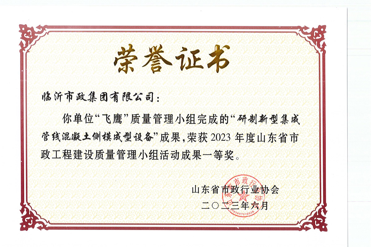 “飞鹰”质量管理小组完成的“研制新型集成管线混凝土侧模成型设备”成果,荣获2023年度山东省市政工程建设质量管理小组活动成果一等奖